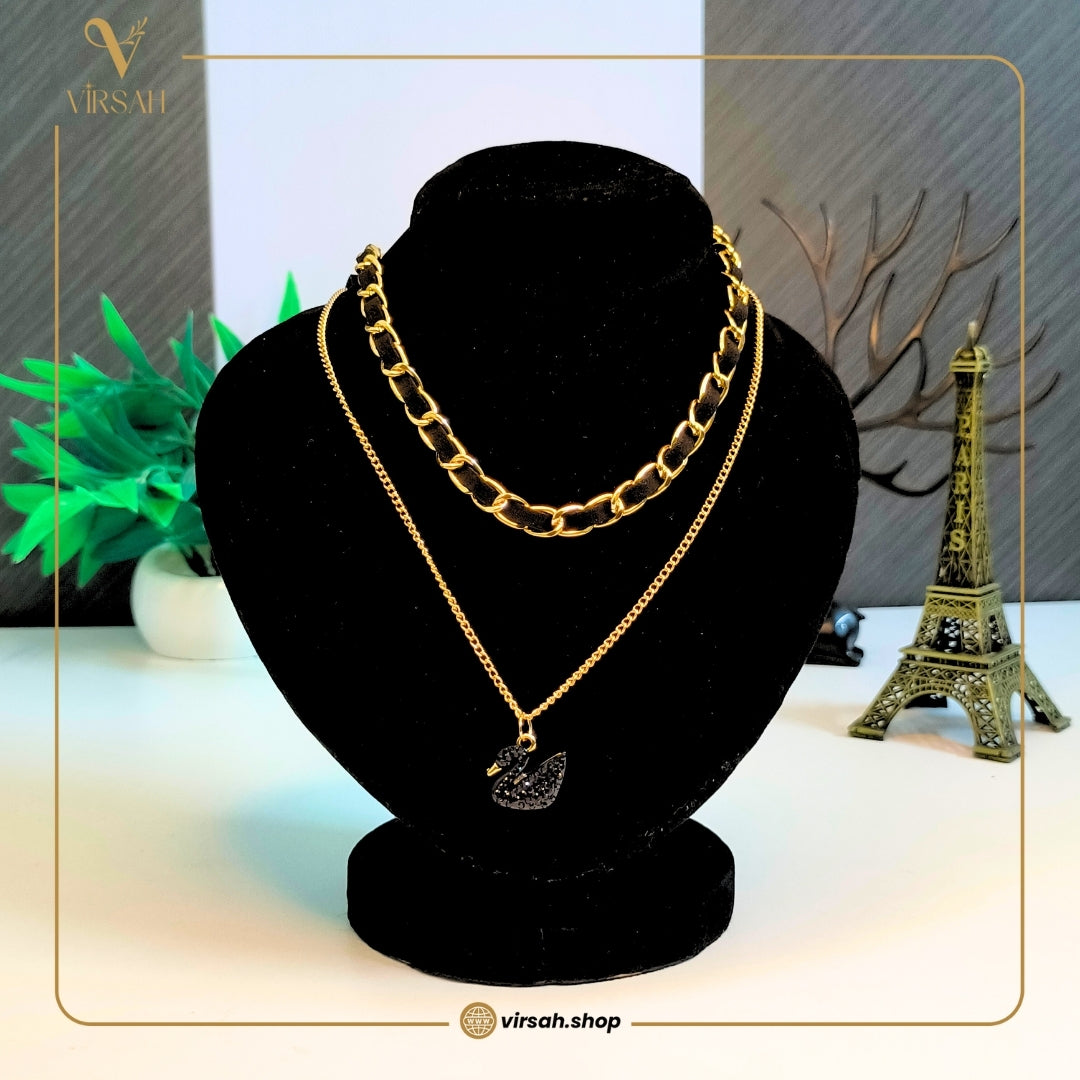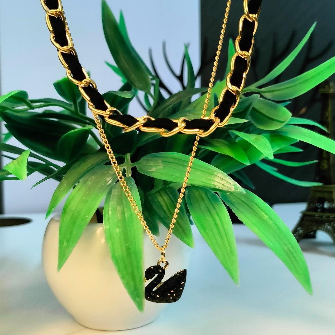 Dual Layer Gold Chain Necklace Set with Black Swan Pendant