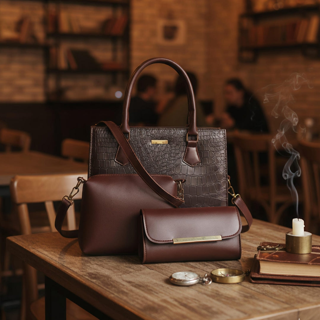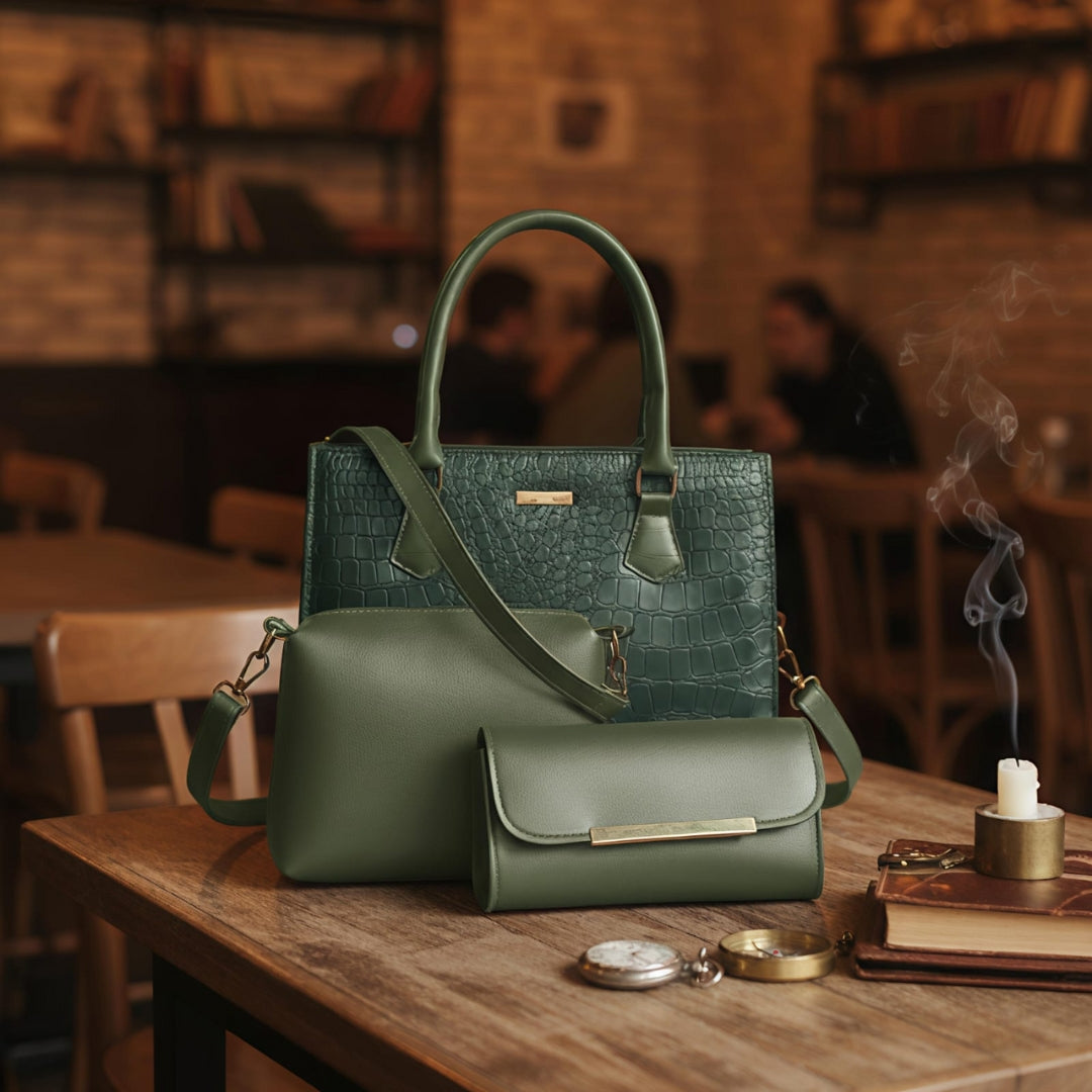 Discover refined sophistication with this beautifully designed 3-piece handbag set. Featuring a luxurious crocodile-inspired texture paired with a smooth, sleek finish, this set offers the perfect blend of style and functionality. The structured main handbag delivers a polished, modern look ideal for both casual and formal settings, while the matching crossbody pouch and clutch wallet provide versatile carrying options.