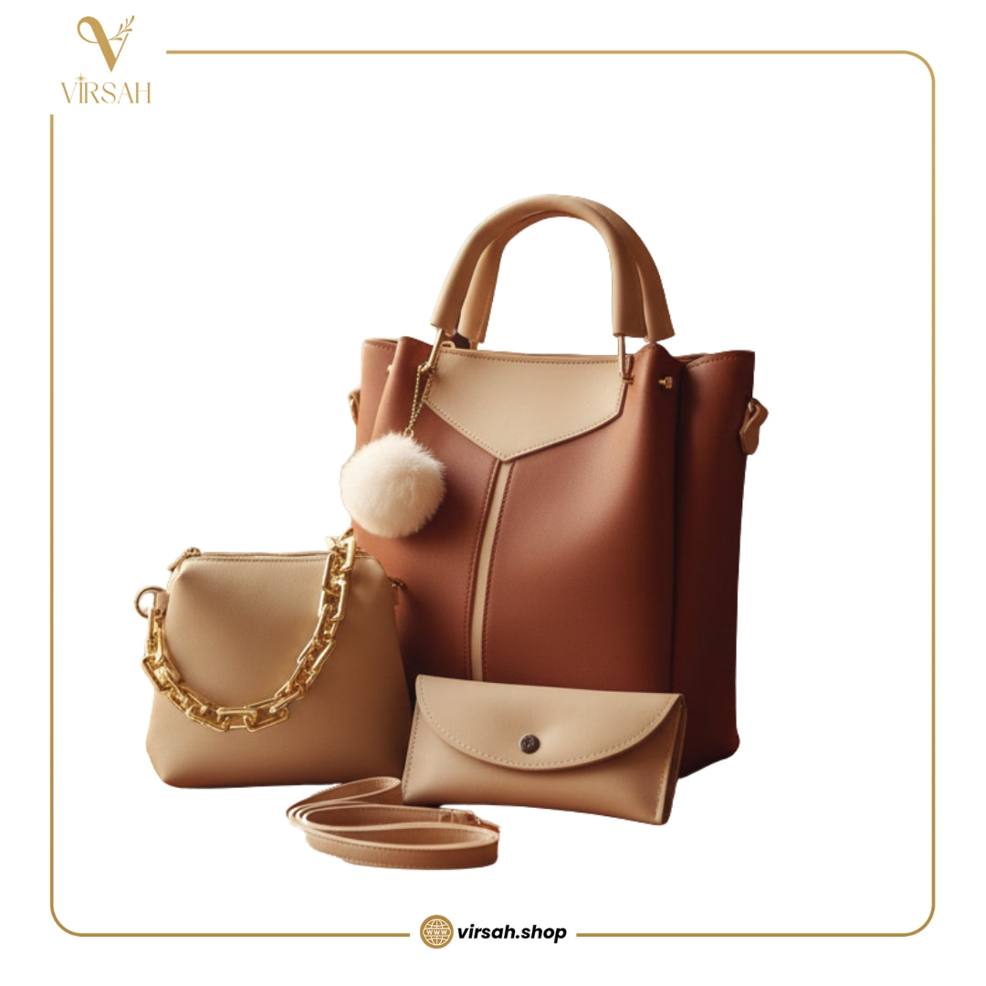 This beautiful set includes a structured tote handbag, a compact mini shoulder bag, and a matching wallet, all crafted from high-quality synthetic leather with refined stitching and premium finishing. The modern design is enhanced with elegant accents and a chic detachable charm, giving the set a sophisticated, designer-inspired look.