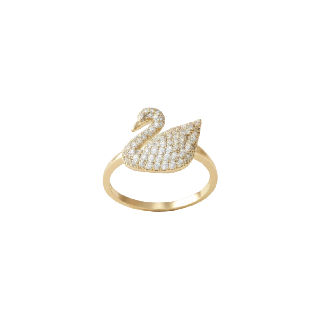 Featuring a refined swan silhouette encrusted with sparkling crystal stones, the ring reflects light beautifully from every angle. The smooth gold-tone band adds warmth and elegance, making it a perfect statement piece for both everyday wear and special occasions.