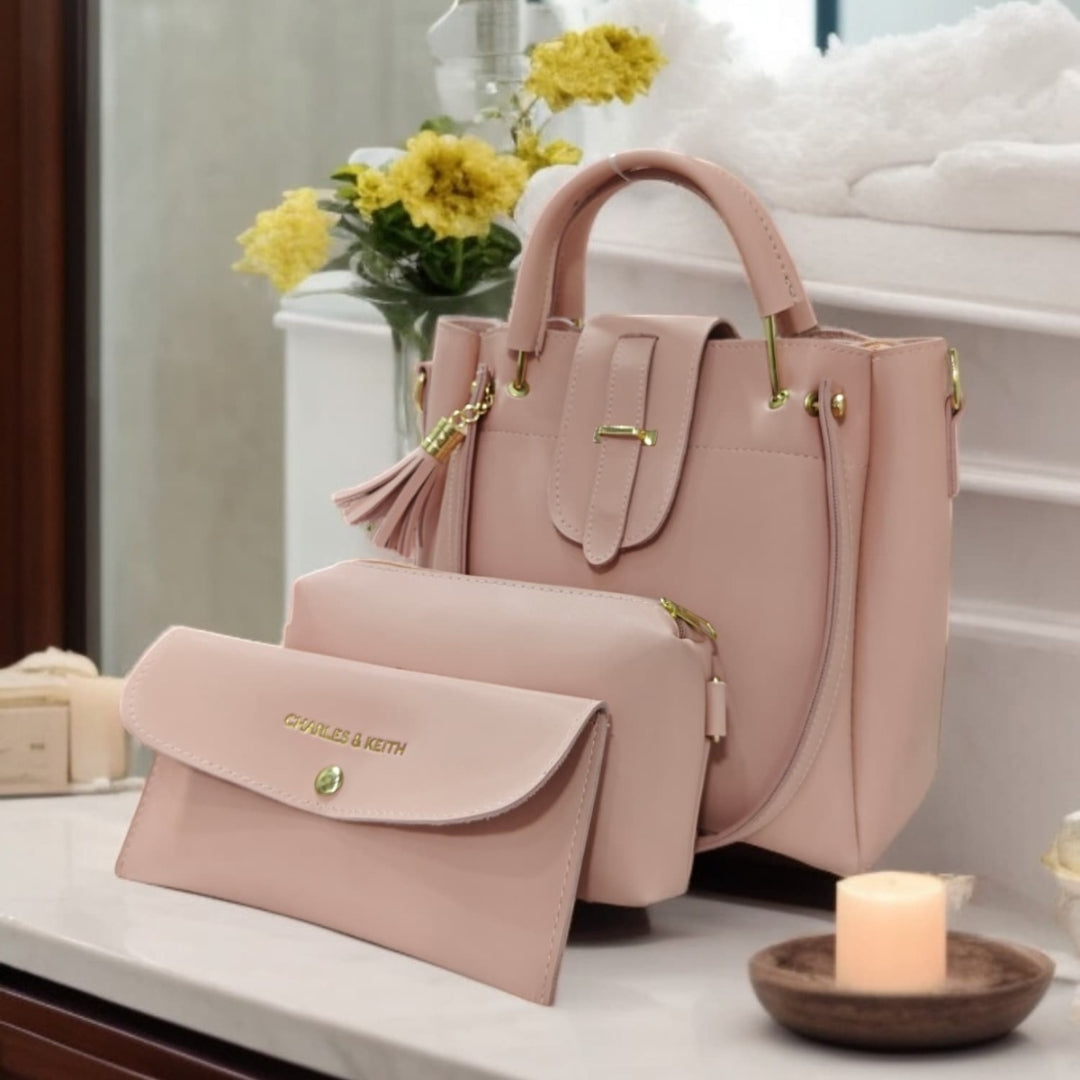 This set includes a main handbag, a sleek clutch, and a matching pouch—perfect for everyday use, outings, office, university, or gifting.