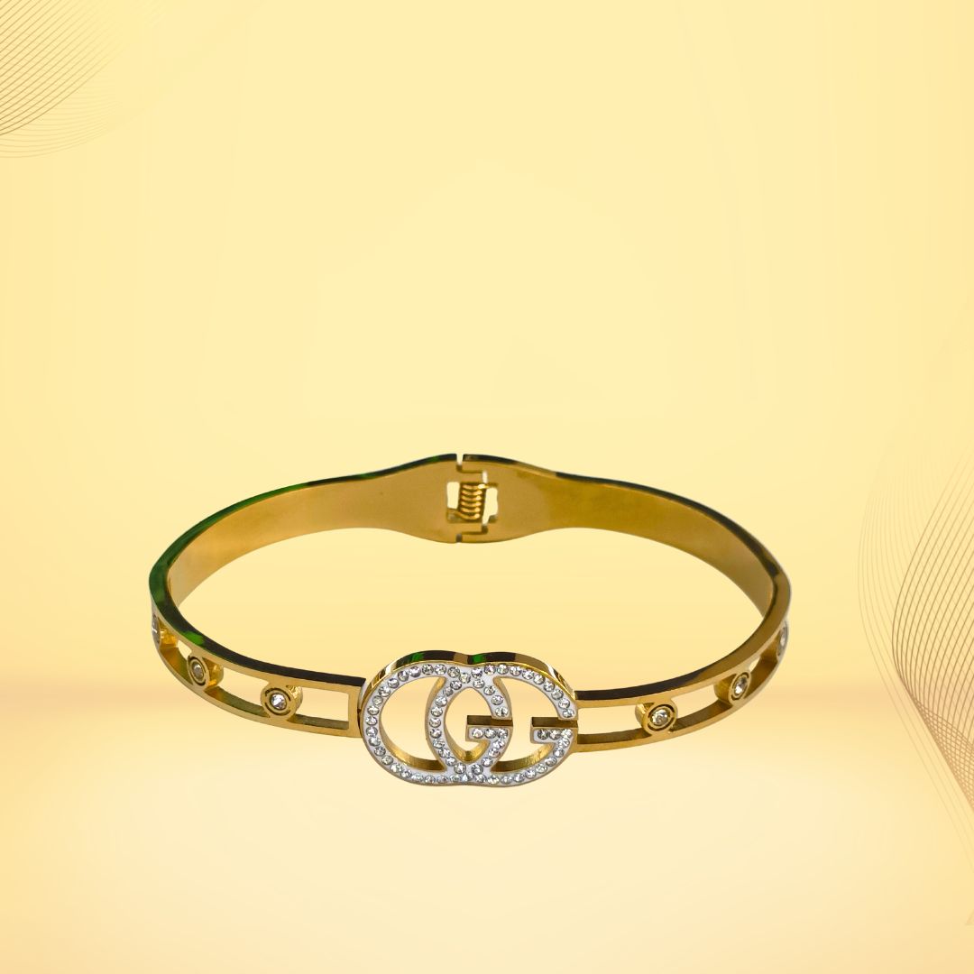 Add elegance to your style with this Premium Gold-Finish Artificial Designer Bangle Bracelet, crafted to offer a luxurious look at an affordable price. This beautifully designed bracelet features a double-G inspired emblem decorated with sparkling crystals, giving it a stylish and fashionable appearance.