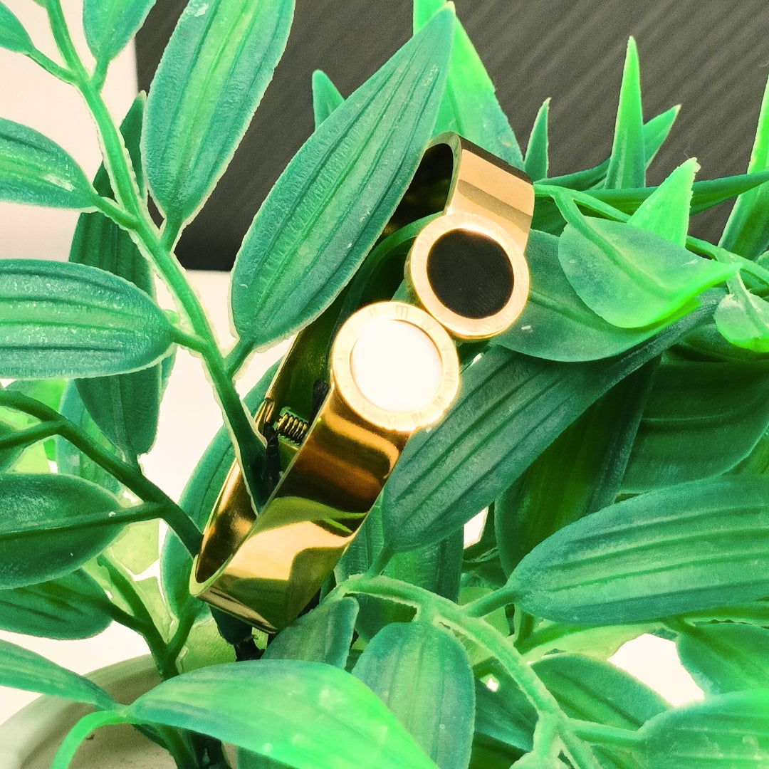 Balance your style with elegance. The Virsah Dual-Tone Bracelet blends gold, black, and white hues for a chic, modern look that complements every outfit.