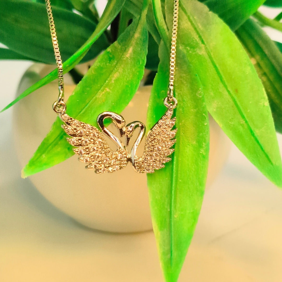 Celebrate grace and eternal love with the Virsah Gold Swan Wings Pendant Necklace — a stunning creation that blends romantic symbolism with timeless elegance. The twin swan design, adorned with shimmering crystals, represents love, purity, and unity. Perfect for both daily elegance and special occasions, this exquisite piece brings a touch of sophistication to every outfit.