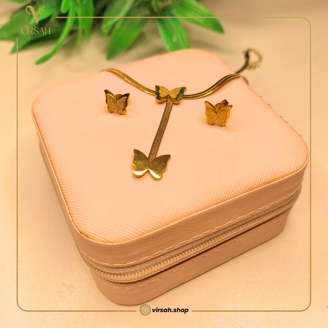Add a touch of elegance and freedom to your style with the Virsah Golden Butterfly Necklace Set. Designed to represent transformation and beauty, this minimalist gold-plated butterfly pendant with matching stud earrings complements every look — from casual chic to evening glamour.