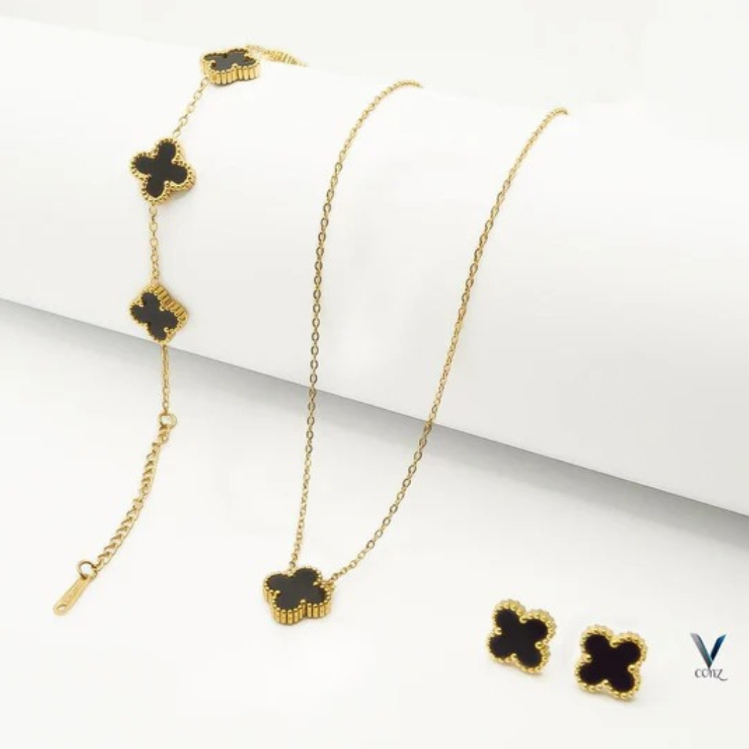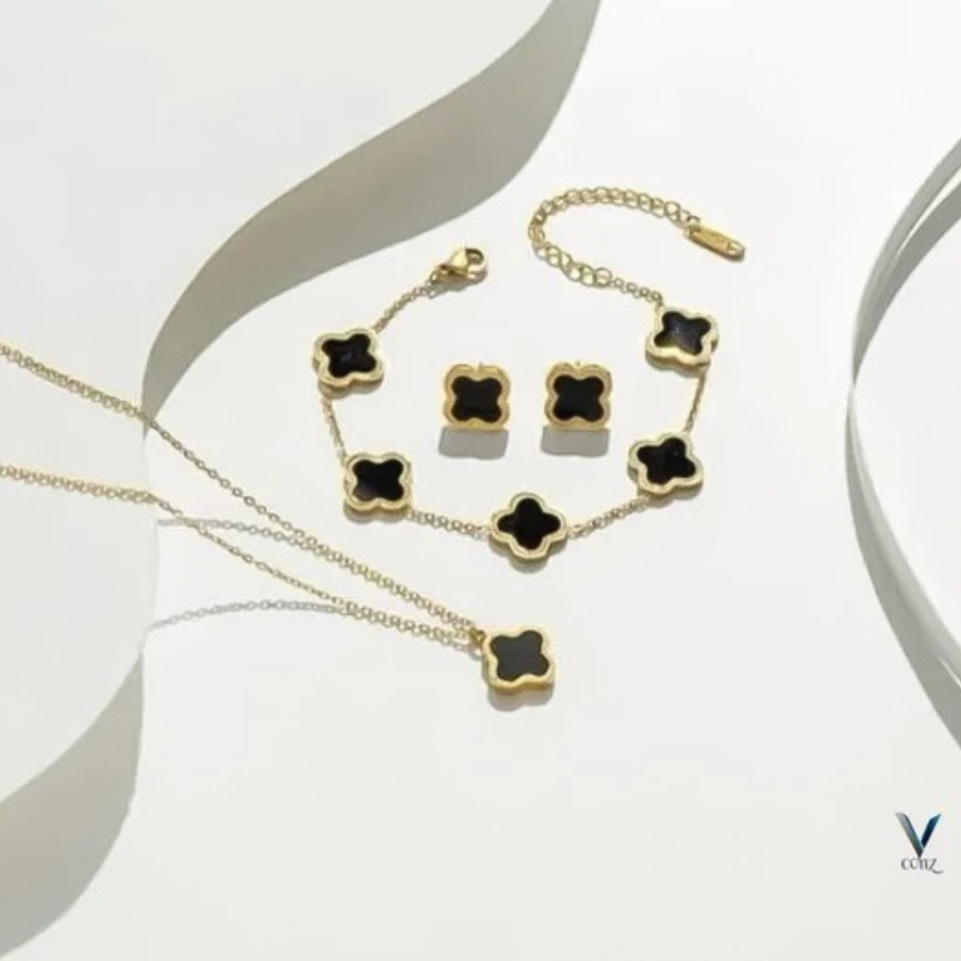 Golden Jewelry Set with Black Flower Design – Necklace, Earrings & Bracelet (3 Pcs)