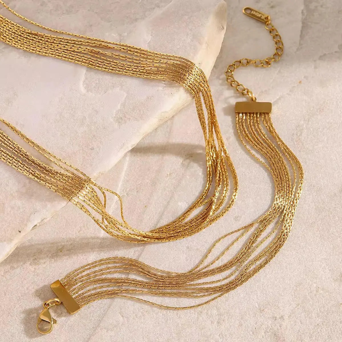 This stylish 8-layer stainless steel necklace is designed to elevate any outfit. Featuring a trendy layered look, it's rust-free, durable, and perfect for daily wear or special occasions. Whether you're heading to a party or a casual outing, this bold yet elegant necklace adds the perfect finishing touch. A must-have accessory for every fashion-forward girl.